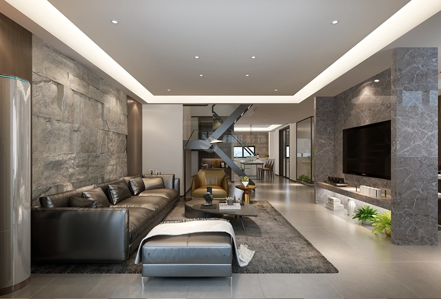 ▲華僑城天鵝堡複式260平米現代簡約王開傑主筆(bǐ)設計——客廳電(diàn)視背景牆設計效果圖