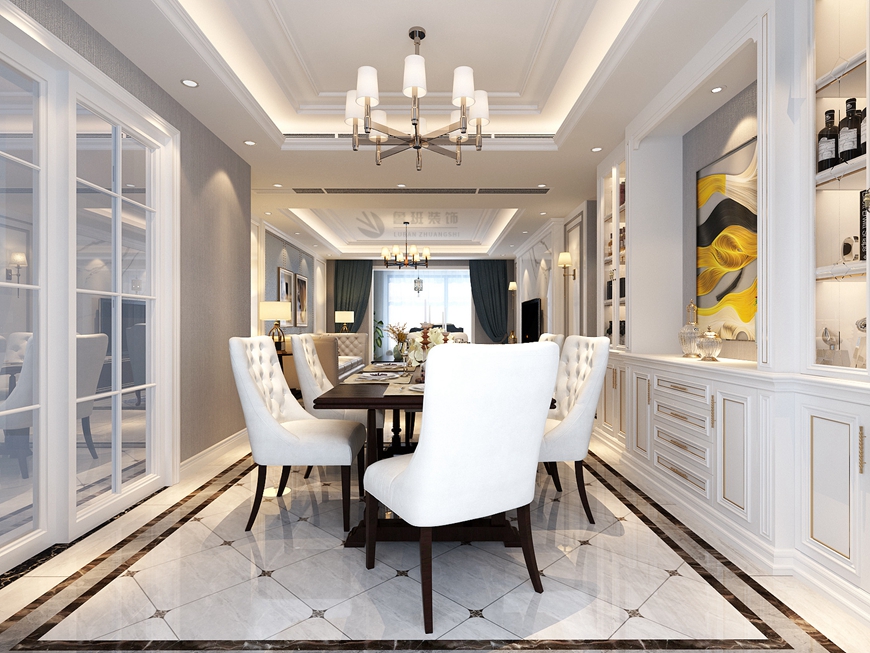 ▲西安(ān)魯班裝(zhuāng)飾龍湖(hú)香醍漫步170平米美式輕奢風設計周倩設計師主筆(bǐ)——餐廳設計效果圖