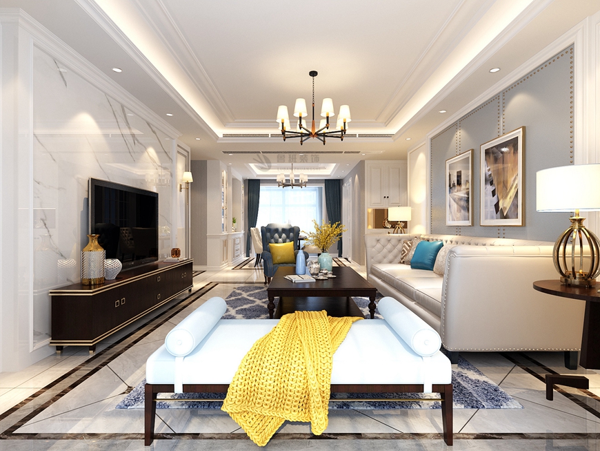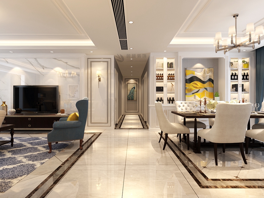 ▲西安(ān)魯班裝(zhuāng)飾龍湖(hú)香醍漫步170平米美式輕奢風設計周倩設計師主筆(bǐ)——客廳設計效果圖